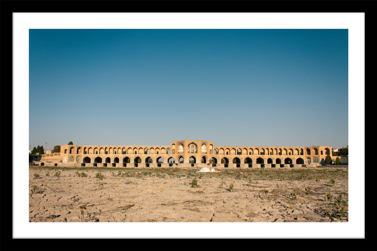 A body lies in the cracked bed of the Zayandeh River, beneath the shadow of Si-o-se-pol in Isfahan.