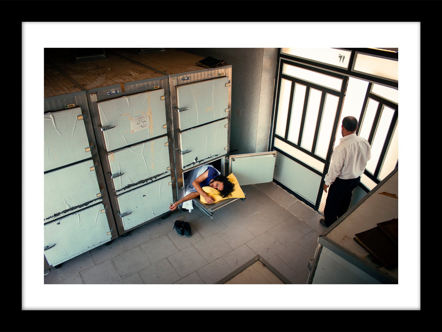 A drawer meant for the dead holds a sleeping body.