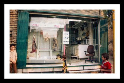 A tired body surrenders behind a butcher’s glass — beside hanging carcasses.